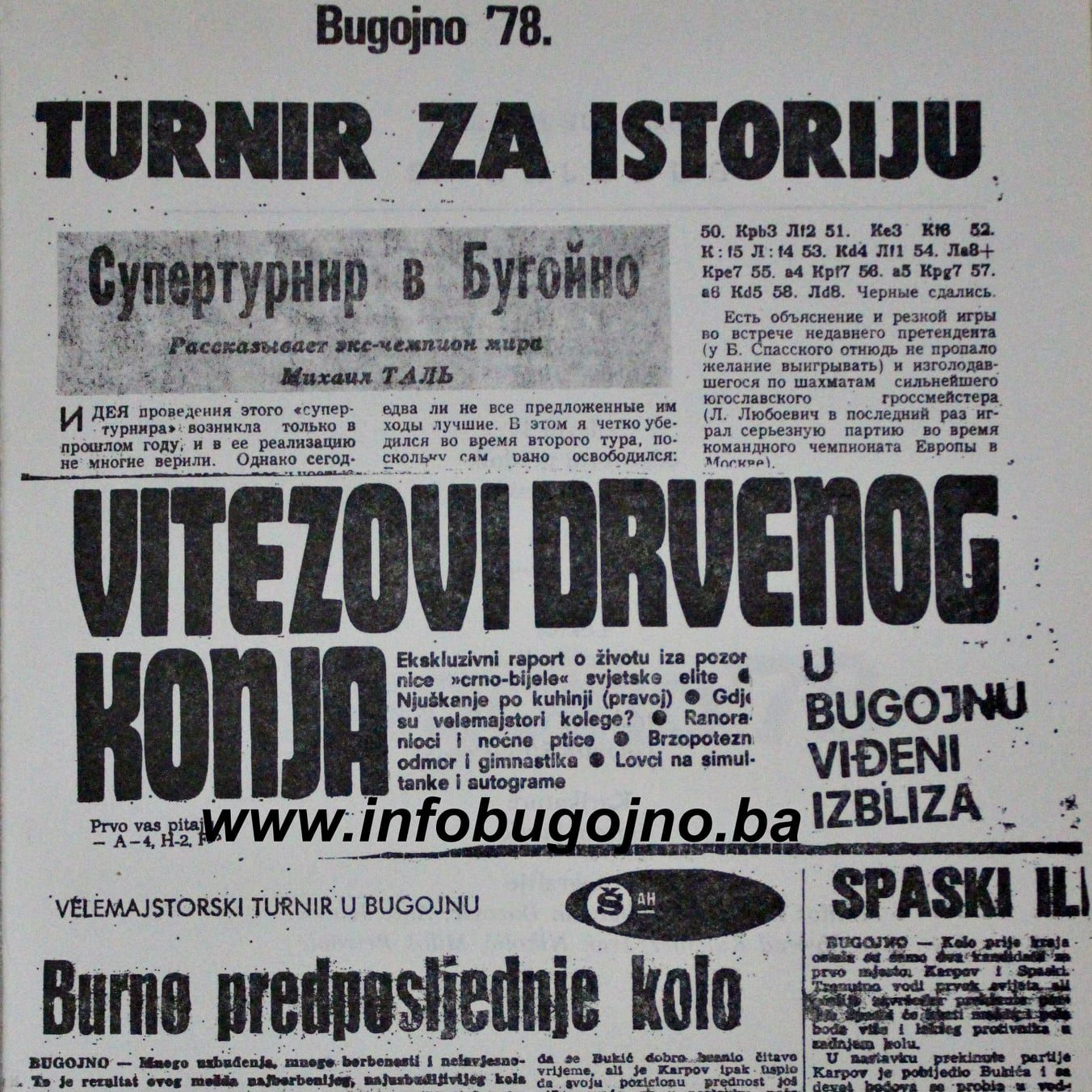Šahovski satovi već mogu da se puste u pokret.Počeo je jedan od najvećih turnira u svijetu.Bugojno,tihi industrijski grad,120 kilometara od Sarajeva,postaje šahovska metropola čitavog svijeta.Odavde će svjetske agencije dvadesetak dana javljati na sve kontinente o žrtvovanim pješacima i figurama.Bugojno 1978